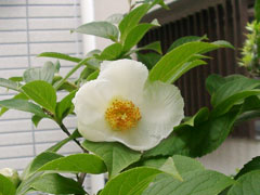 翌年の早春、三原の神明祭の植木市で買ったのが、今回ご紹介する「夏つばき」 いつもこのページで紹介するツバキとはちょっと種類が違うけれど、白の一重、そして花弁がそのまま落ちる姿はツバキに良く似ている。