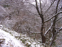 ここからは急ぐ道でもなしぶらぶらと歩く。コースはしっかりしているし、迷いそうなところはありません。登るに連れてだんだんと雪の量が増えてきて、山を下ってくる風の冷たさが増してきます。でも、こっちは暑い。ぶらぶら歩いているつもりでも、エネルギーを消費してるんやなぁと妙な感心をしてしまいます。それに、少しずつやけど高度も稼いでいる。あたりはもうすっかり雪景色。向かい側に見える尾根もすっかり雪化粧。今日の雪は先週までのざらざらした雪ではなく、細かいスキー場にあるような雪。10センチくらい積もってる。クツが雪の中にすっぽり埋まってしまう(ちょと大袈裟やけど)、新雪のコースを歩くのはほんまに気持ちいいね。