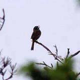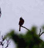 メジロたちが近づいてくるけど、梢や若葉がジャマしてなかなか撮らせてくれない。諦めかけて、タバコを一服していると、ようやくボクの知らない小鳥が枯れ枝に止まってさえずりだした。ちょっと興奮して、夢中になってシャッターを押す。上手く撮れてるかな。この野鳥はちょっと甲高い声で鳴く。鳴くときはご丁寧に、口を上に向けてさえずるのです。