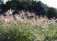 芦屋カントリーの脇を抜けてさらに高度を稼ぐと雨ケ峠。ここにはベンチがある。もちろんどっかりと腰を降ろして水分を補給。身体は熱いが、そよぐ風が心地いい。おたふく山からはマウンテンバイクの団体が降りてきた。道の途中ですれ違わなくてよかった。雨ケ峠からはもう頭上に木は無い。一面笹とススキの原っぱが続く丘陵地帯だ。