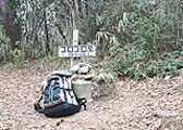 ようやく、谷が終わり、一気に高度を稼ぐクマ笹の道に。と、また水の音。斜面が削られて大黒明王(やったかな?)が祭ってあり、そこに山水が落ちるようにパイプが配してある。ザックを降ろし、この水で喉を潤す。背中からはもうもうと湯気が上がっているのが自分でもわかる。でも「ここはどこ?」