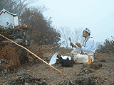 記念撮影を終え、ストーブに火を入れると、またしてもほら貝が響く。そうこうしているうちに荒い息を弾ませて山伏の姿をした行者さんが上がってきた。