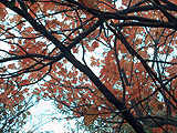 ようやく、ほんの少しガスが切れ始めた。上りのときは余裕がなくて気がつかなかったけれど紅葉が美しい。それにしても、上るも下るのも急で気を使わされるコース。ついつい木に手をついてしまい、幹を揺らし、葉に乗った雨水を全身に浴びてしまう。