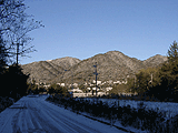 事前の調査によると、ごろごろ橋からのバスの時間がちょうどだ。温度計は0度をちょっと割るくらい。凍てついた舗装道路に手を焼きながら見上げると、東お多福山も綺麗に雪化粧していました。