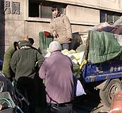 予想通り、しばらく行くと人が集まりだし、平屋の建物からは煙とも湯気とも見分けがつかない白いものがもうもうと上がっている。近づいて行くと、そこはどうやら市民プール(!)のよう。確かにそう書いてあるんだけど、これはどう見ても常設の市場。何箇所にブロックが分かれていて、雑多な日用品、野菜、白菜、果物、そして肉(鳥、豚)などが主に売られている。白菜だけは他の野菜とは独立してブロックがある。こりゃ凄い。以前、上海の人が「北京は白菜ばっかり」と言っていたのを思い出す。